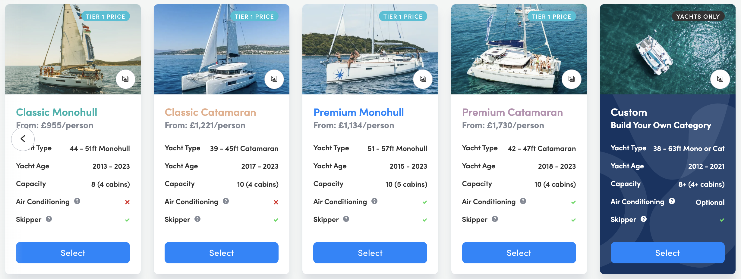 These options are great if you’re a TYW newbie and/or you don’t know or care about what model of boat you’re on. If you care about size, capacity, and whether or not you’ll have a host, these are great options. For some boats, if you do decide to fill to a capacity of 10, keep in mind that 2 of those people will be sleeping in what is called “the Saloon” spot, or the living room of the boat. When deciding who pays what, these spots are typically discounted since those sleeping there won’t have the same closet space or privacy as the others with cabins!